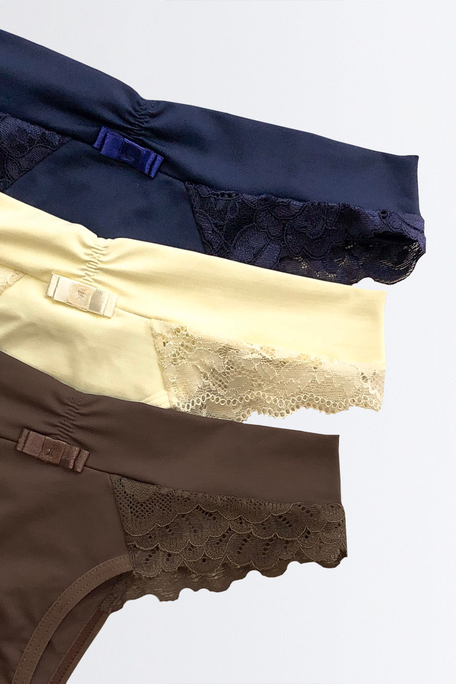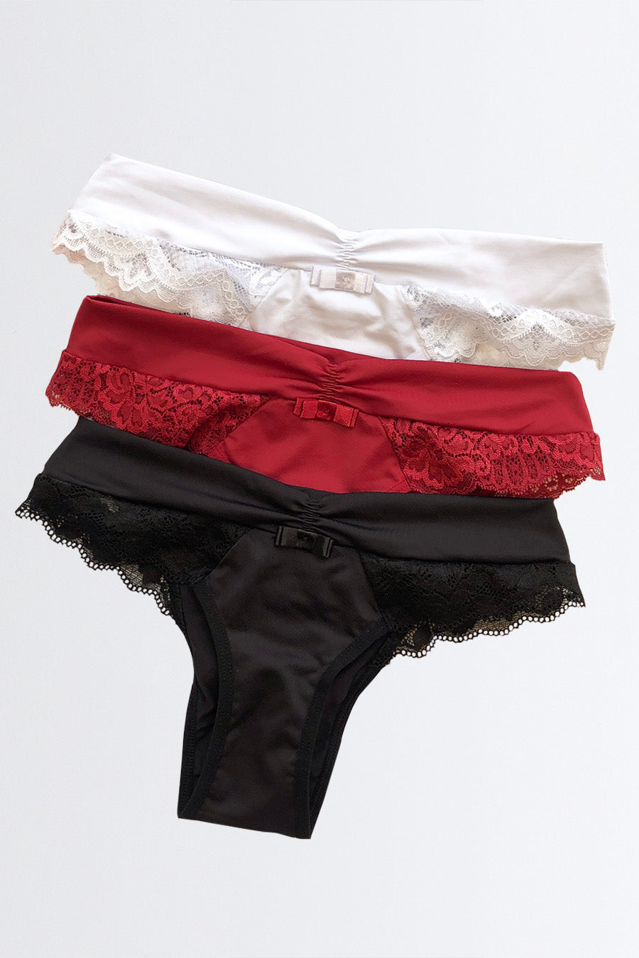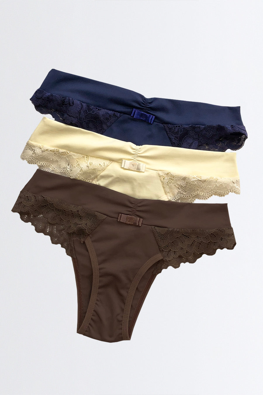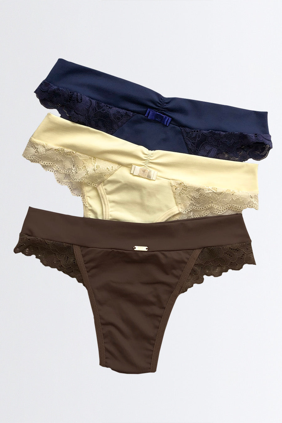 Experimente o conforto e a elegância do Kit 3 Calcinhas Biquíni com Renda da Nuance Lingerie. Perfeitas para o dia a dia, oferecendo ajuste ideal e toque suave.