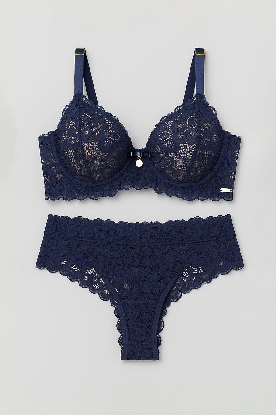 O soutien foi desenvolvido em microfibra macia, com detalhes em renda delicada e bojo que oferece sustentação e modela os seios de forma natural. Já a calcinha fio de renda complementa o conjunto com toque sofisticado, valorizando as curvas com leveza e feminilidade.