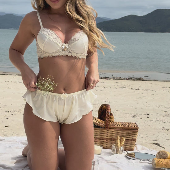 Descubra a sofisticação do trio de lingerie sem bojo em tecido gloss com detalhes em renda. Caleçon com babados e calcinha string para um look elegante e confortável.